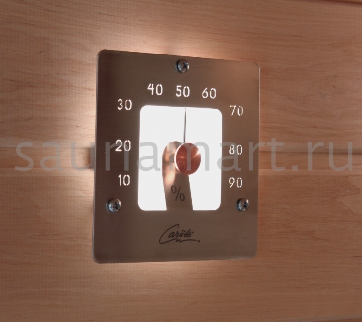 Гигрометр Cariitti SQ – это незаменимая деталь, необходимая для измерения относительной влажности воздуха в сауне. Данная модель оборудована собственной подсветкой и выгодно дополнит интерьер любой сауны. Лучшим местом для установки прибора станет дальняя стенка относительно входа и печи. Подходящая высота для размещения гигрометра – 1.5 м от пола.