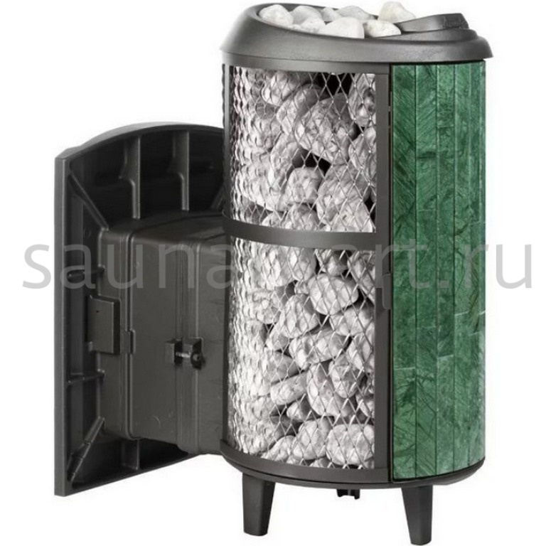 Модель с комбинированной облицовкой из нержавеющей сетки и ламелей. Особенность модели - открывающаяся дверь с ламелями. Это оригинальное решение обеспечивает быстрый прогрев парной.