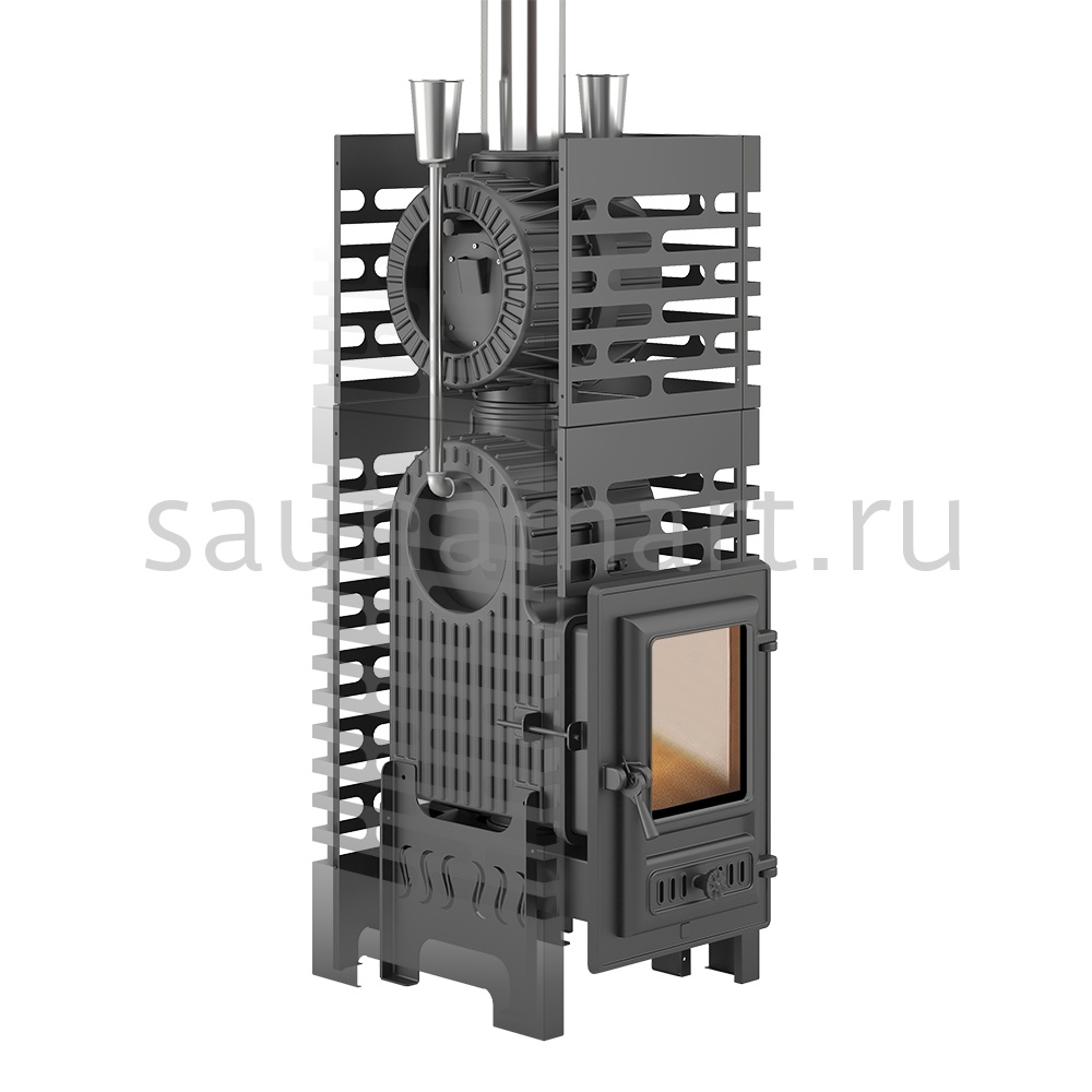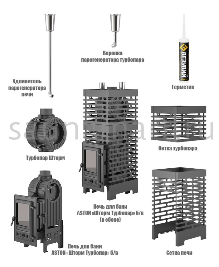 Комплект состоит из чугунной банной печи Астон Шторм 18 и чугунной натрубной каменки Турбопар. Объединение двух конструкций в единую систему заметно увеличивает тепловую отдачу термоагрегата, предотвращает перегрев дымохода, организует дополнительную каменку для получения качественного пара.