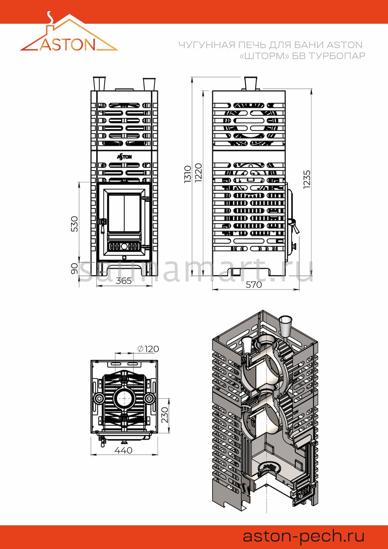 Особенности модификаций: Чугунные печи ASTON и ASTON "Шторм Турбопар" представлены в нескольких модификациях, отличающихся длиной топочного тоннеля. Модели с обозначением "б/в" (без выноса) не имеют выноса и предназначены для обслуживания из парной. Стандартные модификации и версии Long позволяют топить печь из предбанника, при этом толщина стены может достигать 14 см для стандартных моделей и 28 см для модификации Long.