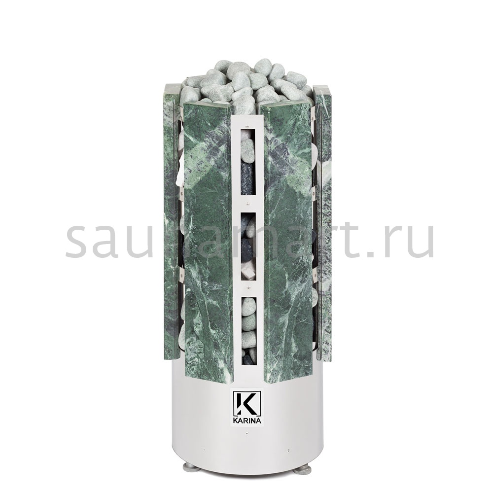 Электрокаменка Karina Forta 8 Змеевик предназначена для использования в парных объемом до 12м3. Печь выполнена в напольном варианте и обладает цилиндрической формой дополненной плитами из натурального камня Змеевика. Напряжение питания - 220/380В. Данная модель имеет 3 тэна, расположенных в виде треугольника. В центре внизу расположен бак для воды емкостью 3 л, который является парогенератором. Выше парогенератора имеется емкость под мелкие камни или нержавеющие шары объемом 2.5 л, вмещающая 5 кг мелкого камня, называемая закрытой каменкой с воронкой для подачи воды и получения мелкодисперсного пара. Электрическая печь Karina Forta 8 Змеевик многофункциональна, и при правильной эксплуатации она подойдет для любителей как финской сауны, так и русской бани.