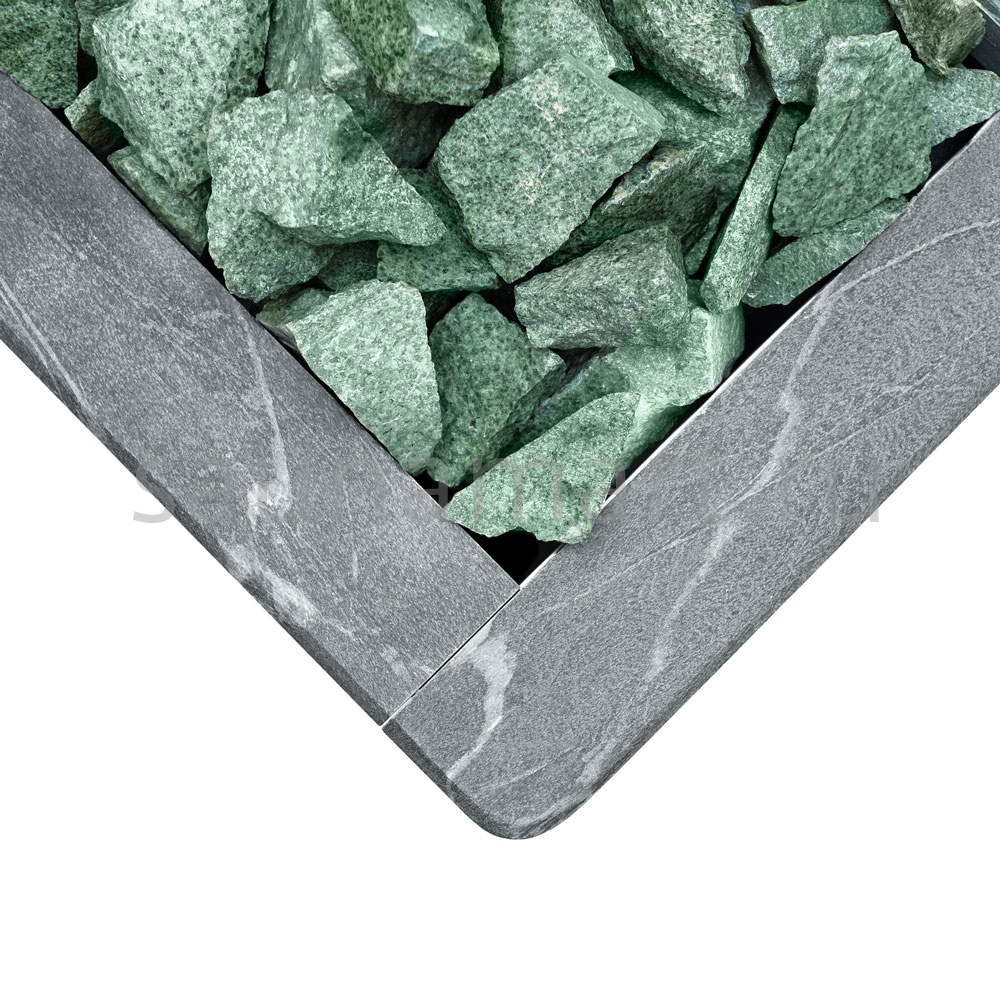Главной особенностью серии Quadro является полная облицовка натуральным талькохлоритом - камнем с уникальными теплоаккумулирующими свойствами. При нагреве талькохлорит мягко излучает тепло, создавая особый микроклимат в парной. Этот природный материал не только обеспечивает равномерный прогрев, но и выделяет полезные минеральные вещества, благотворно влияющие на здоровье.