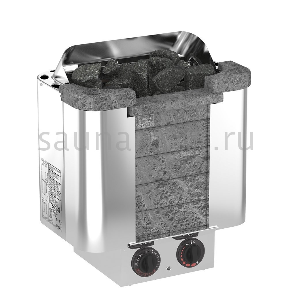 Печь SAWO Cumulus CML-60NB-P – это интересный подход к классической каменке для домашних саун. Печь дополнена элегантной панелью из талькохлорита с передней стороны – это 10 кг дополнительных банных камней, дающих приятное тепло и мягкий пар. Эргономичная, стильная и функциональная электрокаменка. Печь устанавливается навесным способом на стену. Основным материалом для производства финские инженеры избрали устойчивую к коррозии высококачественную нержавеющую сталь. Материал обеспечивает не только длительный срок эксплуатации, но и достойный внешний вид электрокаменки. Особой изюминкой печи CUMULUS CML-60NB является облицовка из талькохлорита фронтальной части печи. Сверху печь имеет 2 арома чаши из натурального камня, что непременно оценят любители ароматерапии. Электрокаменка вмещает в себя до 18 кг камней, которые вместе с талькохлоритной облицовкой массой 10 кг ускоряют прогрев сауны и снижают расход электроэнергии на поддержание нужной температуры воздуха. Подливая на камни воду или отвар из трав, вы быстро наполните парную большим количеством лёгкого мелкодисперсного пара. Управление осуществляется при помощи встроенной в нижнюю часть каменки панели управления.