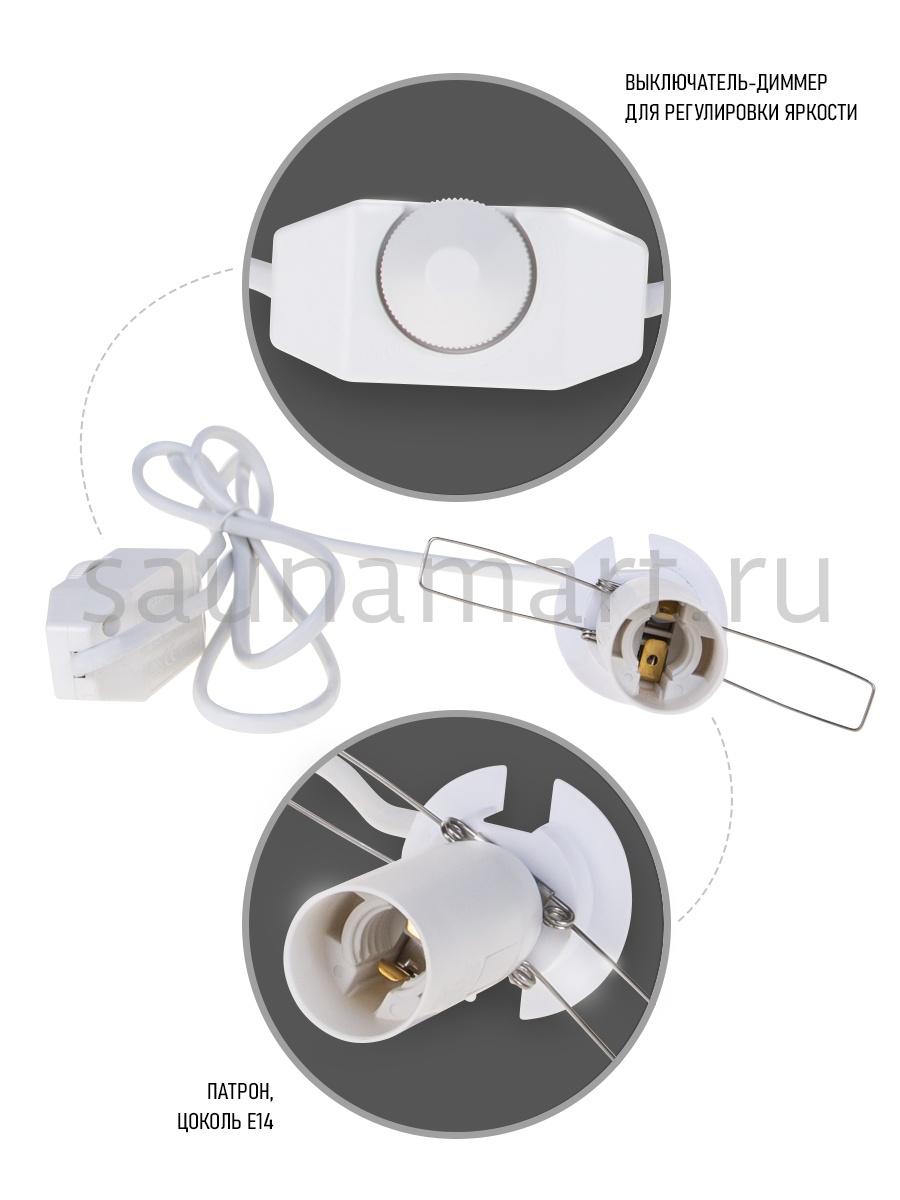Изделие представляет собой:  сетевой шнур двухжильный длиной 150 см белого цвета; плоская литая сетевая вилка стандарта евро; патрон с металлическими усиками для крепления и цоколем  Е14; диммер, включающий и выключающий электроприбор с возможностью плавного регулирования яркости освещения.