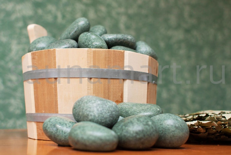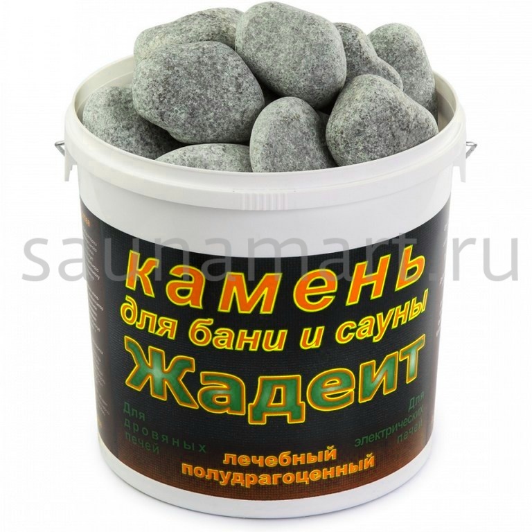 Камень жадеит шлифованный крупный фракции 100-150 мм — элитный наполнитель для банных печей. Упаковка: ведро 20 кг с сертификатом качества.