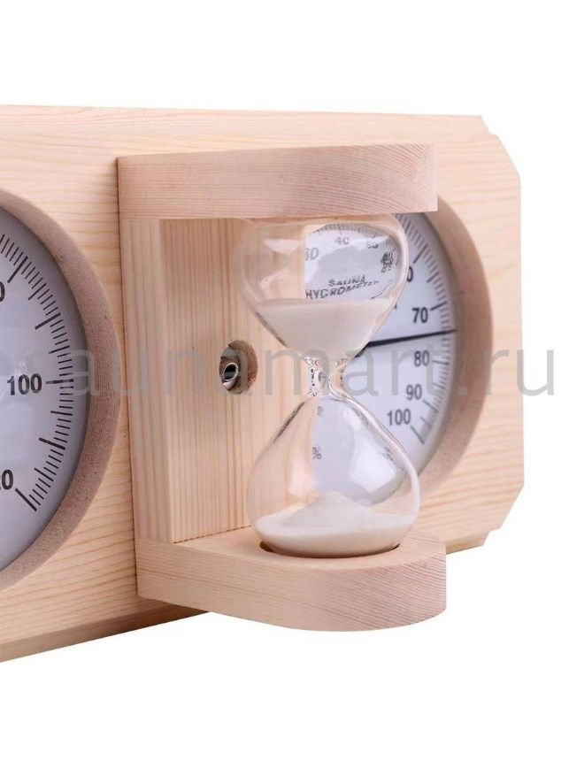 Термогигрометр со встроенными песочными часами 3 в 1 это товары для бани и сауны, - универсальные аксессуары для обустройства бани, которые создают уют, комфорт, удобство и особенную атмосферу в парилке русской бани. В широкой раме из дерева находятся два круглых циферблата под термостойким стеклом: термометр и гигрометр. Градуировка шкалы гигрометра варьируется в пределах от 0 до 100 %. Градуировка шкалы термометра варьируется в пределах от 0 до 120 градусов по Цельсию. Предусмотрена возможность калибровки измерительного прибора. Между циферблатами располагаются песочные часы для бани, рассчитанные на 15 минут. Это идеальное время нахождения в парилке. Банный аксессуар не боится высокой влажности и температуры, поэтому идеально подходит для использования в любом парильном помещении, как в условиях русской бани, финской сауны так и хамама. Предназначен для настенного размещения. Помните, чтобы проведённое в парной время оказало благоприятный эффект на здоровье и самочувствие, необходимо тщательно соблюдать температурный режим парения, режим влажности и длительности пребывания в парной. Не подвергайте прибор ударам и падению. Упаковано в картонную коробку. Все банные принадлежности нужно выбирать тщательным образом. Представленный банный аксессуар изготовлен из экологичного сырья и прошел все этапы сушки и обработки. Банная метеостанция станет прекрасным подарком для банщиков, отца, мамы, дедушки, мужа, сына, внука, друга, брата, которые любят русскую баню. Эта стильное интерьерное решение подойдет еще и для ванной комнаты и балкона.
